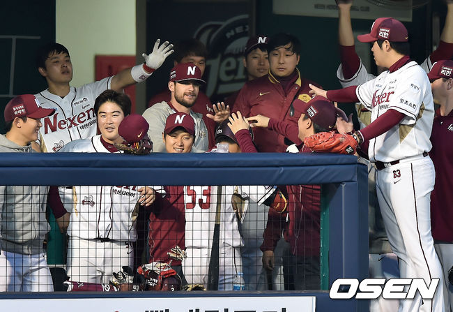 22일 오후 서울 목동야구장서 열린 '2015 타이어뱅크 KBO 리그' 넥센 히어로즈와 두산 베어스의 경기, 3회말 1사 넥센 고종욱이 솔로 홈런을 날린 후 덕아웃에서 동료들과 기쁨을 나누고 있다.