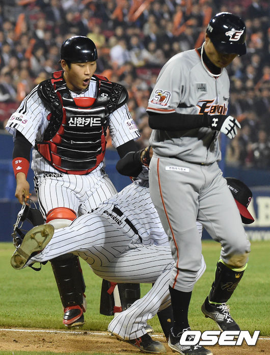 22일 오후 서울 잠실구장에서 열린 '2015 타이어뱅크 KBO 리그' LG 트윈스와 한화 이글스의 경기 4회초 무사 1루 권용관의 번트 뜬공을 잡은 임지섭이 1루로 달리던 권용관과 충돌해 넘어지고 있다.