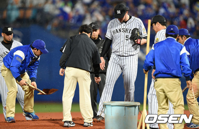 6회말 1사 1,3루에서 한신 랜디 메신저가 비로 젖은 마운드에 대한 불만을 어필하고 있다.