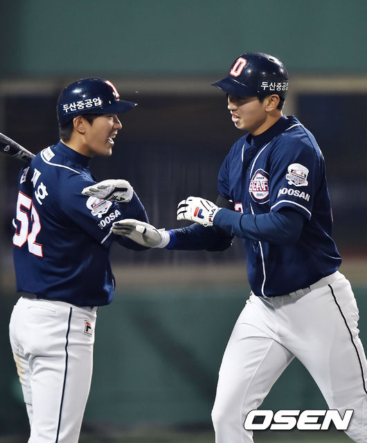 22일 오후 서울 목동야구장서 열린 '2015 타이어뱅크 KBO 리그' 넥센 히어로즈와 두산 베어스의 경기, 6회초 두산 선두타자 정진호가 좌월 솔로 홈런을 날린 후 홈에서 김재호와 하이파이브를 하고 있다.