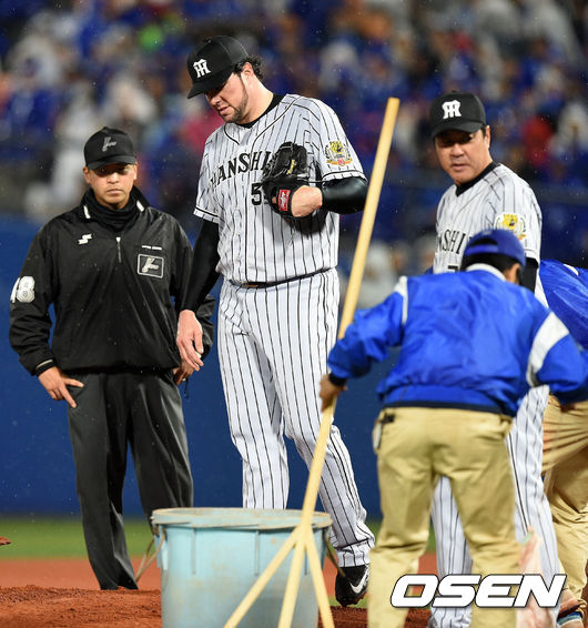 6회말 1사 1,3루에서 한신 랜디 메신저가 비로 젖은 마운드에 대한 불만을 어필하고 있다.