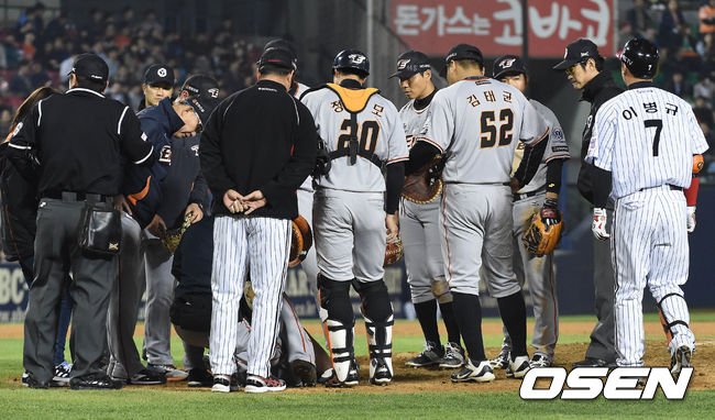 22일 오후 서울 잠실구장에서 열린 '2015 타이어뱅크 KBO 리그' LG 트윈스와 한화 이글스의 경기 4회말 선두타자 이병규의 타구를 맞은 유창식이 마운드에 쓰러져있는 가운데, 동료들이 상태를 살피고 있다.