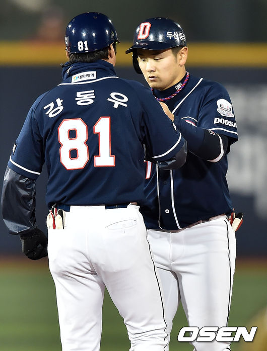 22일 오후 서울 목동야구장서 열린 '2015 타이어뱅크 KBO 리그' 넥센 히어로즈와 두산 베어스의 경기, 6회초 무사 주자 3루 두산 최주환 우중간 1타점 2루타를 날린 후 2루에서 강동우 코치와 하이파이브를 하고 있다.