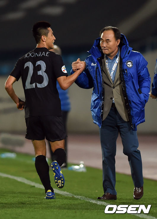 전반 성남 남준재가 추가골을 넣은 뒤 김학범 감독과 하이파이브를 하고 있다.