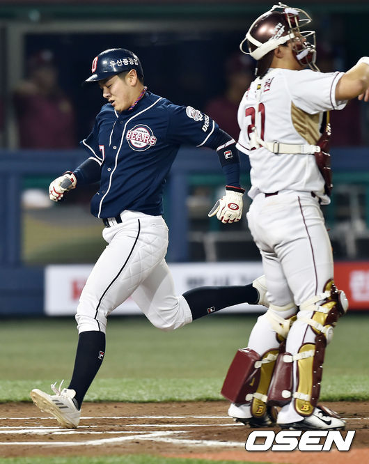 22일 오후 서울 목동야구장서 열린 '2015 타이어뱅크 KBO 리그' 넥센 히어로즈와 두산 베어스의 경기, 6회초 무사 주자 2루 두산 김현수의 동점 1타점 적시타때 2루 주자 최주환이 홈을 밟고 있다.