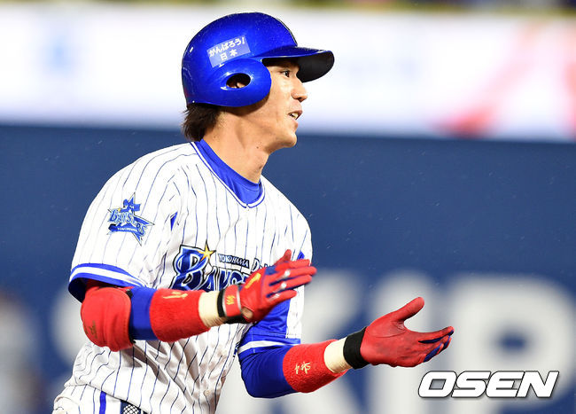 6회말 2사 1,3루에서 요코하마 아라나미가 우월 스리런 홈런을 치고 환호하고 있다.