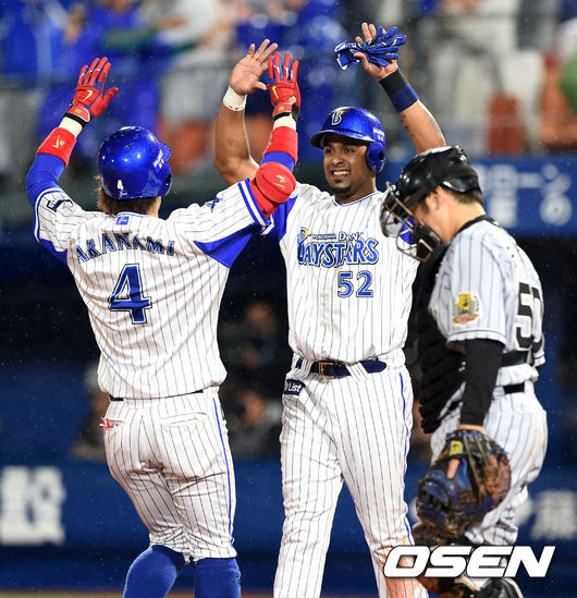 6회말 2사 1,3루에서 요코하마 아라나미가 우월 스리런 홈런을 치고 홈에서 발디리스와 환호하고 있다.