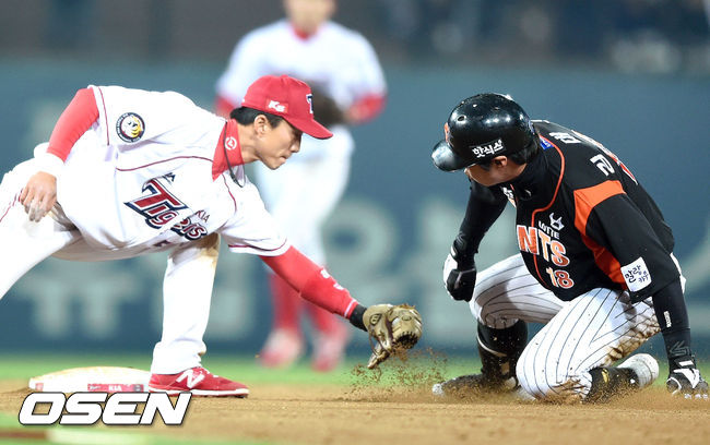 22일 오후 광주-기아 챔피언스필드서 열린 '2015 타이어뱅크 KBO리그' KIA 타이거즈와 롯데 자이언츠의 경기, 8회초 1사 1루 롯데 이대우의 병살타때 이대우가 송구가 뒤로 빠지자 2루로 달렸다. KIA 최용규 2루수에게 타자 이대우를 태그아웃시키고 있다
