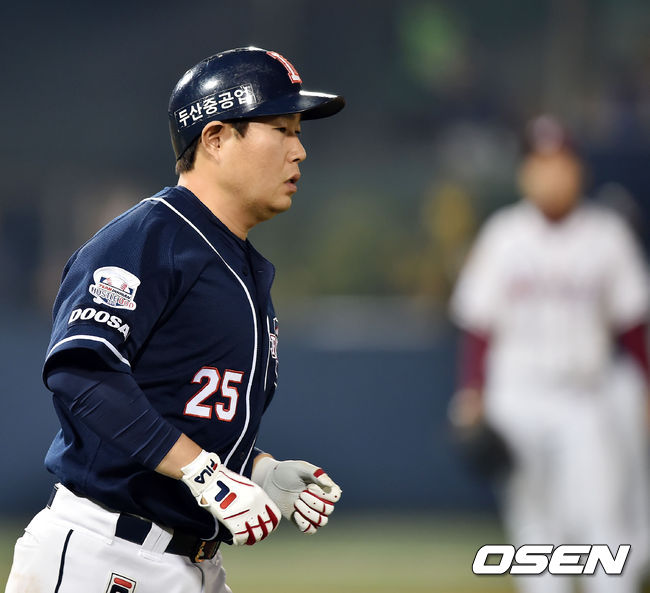 22일 오후 서울 목동야구장서 열린 '2015 타이어뱅크 KBO 리그' 넥센 히어로즈와 두산 베어스의 경기, 8회초 무사 주자 1루 양의지가 우월 투런 홈런을 날린 후 그라운드를 돌고 있다.