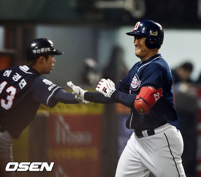 22일 오후 서울 목동야구장서 열린 '2015 타이어뱅크 KBO 리그' 넥센 히어로즈와 두산 베어스의 경기, 9회초 두산 선두타자 홍성흔이 우월 솔로홈런을 날린 후 홈을 밟고 있다.