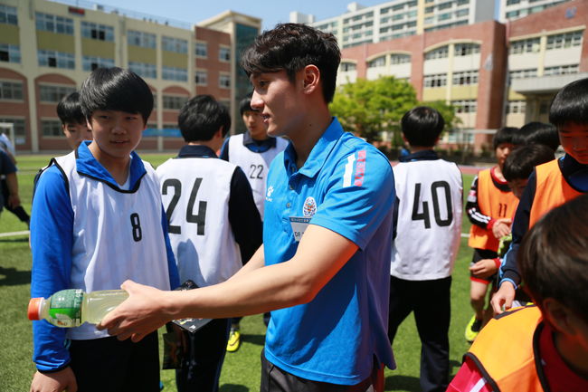 준비운동으로 시작된 체육수업은 공 뺏기, 패스, 볼 트래핑 등 기본기 교육과 수분섭취교육으로 이어졌다. 마지막에는 팀을 나눠 다함께 경기를 하며 즐거운 시간을 보냈다. 배식봉사와 팬 사인회에도 많은 학생들이 몰려 성황을 이뤘다.
