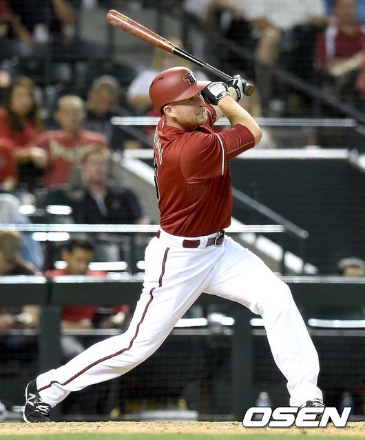 5회말 애리조나 공격 2사 1루 상황 4번타자 마크 트럼보가 달아나는 1타점 중전 적시타를 날리고 있다.