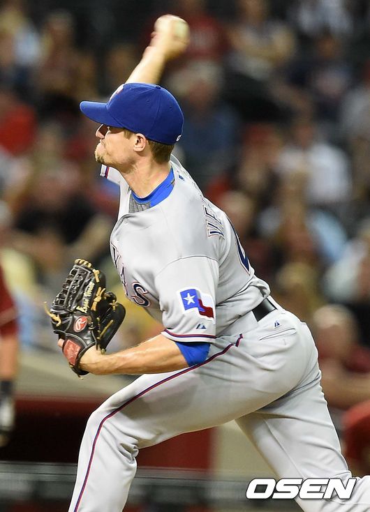 7회말 애리조나 공격 때 마운드에 오른 텍사스 투수 로간 버넷이 힘차게 공을 뿌리고 있다.