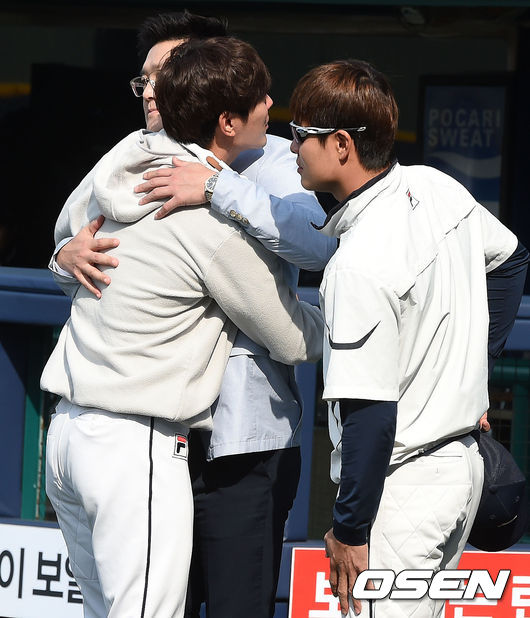 경기에 앞서 두산 김재호가 김선우 위원과 포옹을 하며 인사를 나누고 있다.