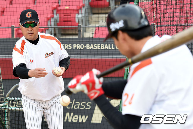 롯데 장종훈 코치가 김문호에게 토스 배팅볼을 던져주고 있다.