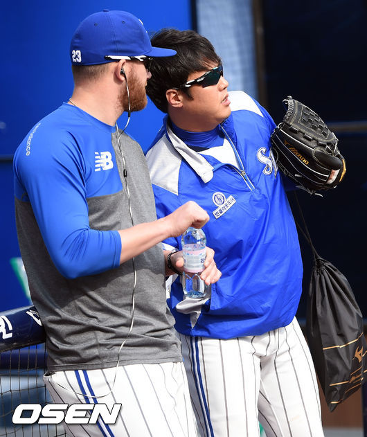 23일 오후 창원시 마산구장에서 열리는'2015 타이어뱅크 KBO리그' NC 다이노스와 삼성 라이온즈의 경기에 앞서 삼성 안지만이 클로이드에게 장난을 치고 있다.