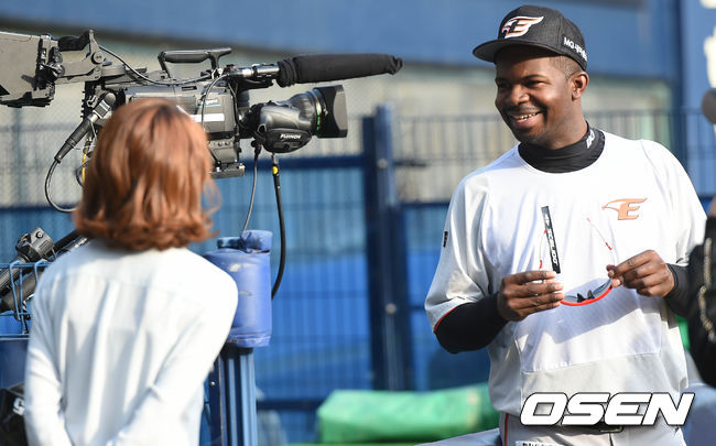 23일 오후 서울 잠실야구장에서 열린 '2015 타이어뱅크 KBO 리그' LG 트윈스와 한화 이글스의 경기, 한화 유먼이 연상은 아나운서와 이야기를 나누고 있다.