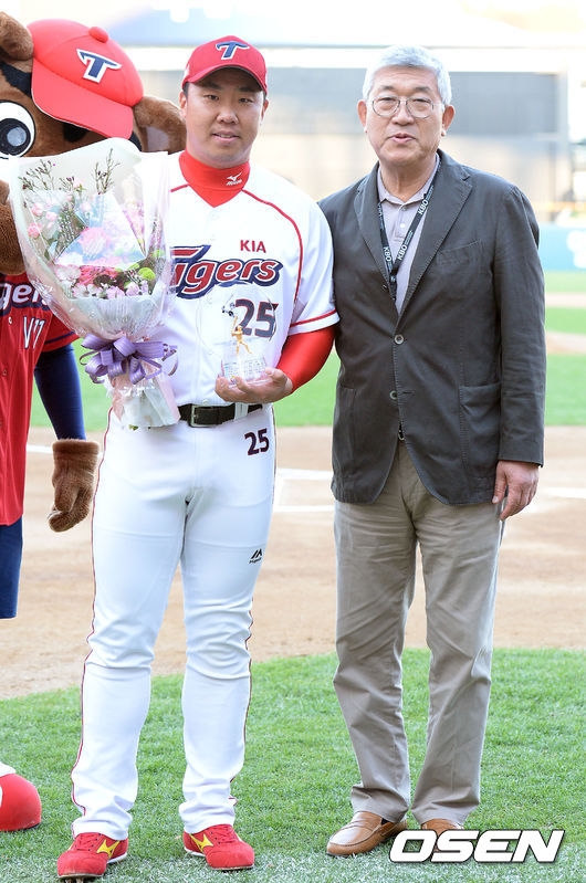 경기에 앞서 KIA 이범호가 프로통산 1500경기 출전기념 행사에서 유남호 경기 감독관과 포토타임을 갖고 있다.