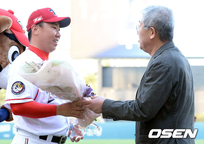 경기에 앞서 KIA 이범호가 프로통산 1500경기 출전기념 행사에서 유남호 경기 감독관으로부터 꽃다발과 기념패를 건네받고 있다.