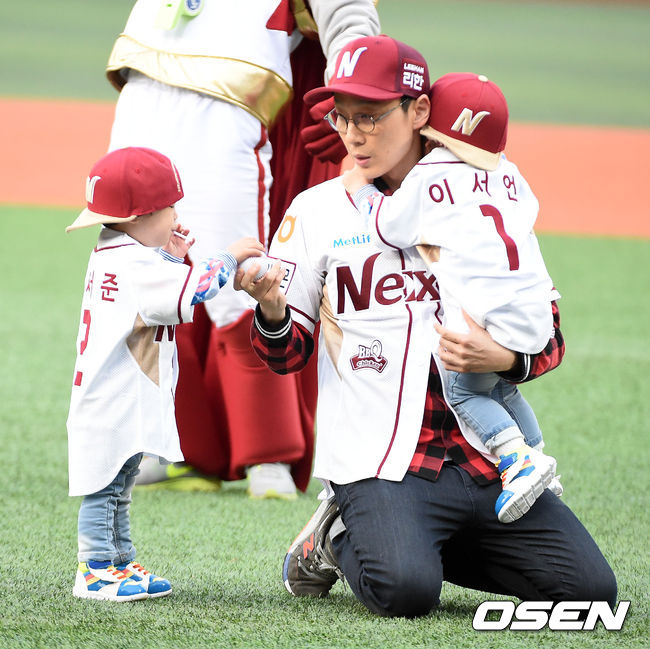 경기에 앞서 개그맨 이휘재와 쌍둥이 아들 이서언, 이서준 군이 시구자로 나서 시구를 준비하고 있다.