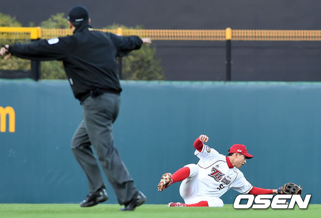 1회초 2사 KIA 김호령이 롯데 황재균의 타구를 잡았다 놓치고 있다.