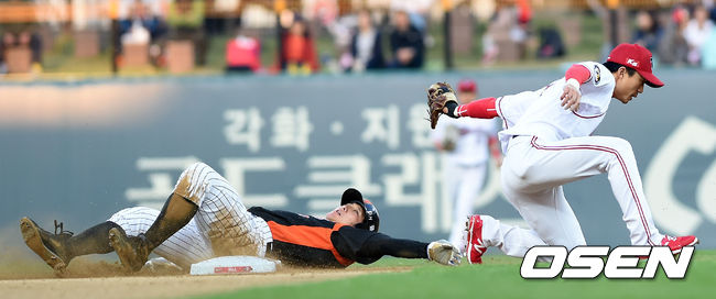 1회초 2사 1루 롯데 황재균이 2루 도루를 시도하고 있다.