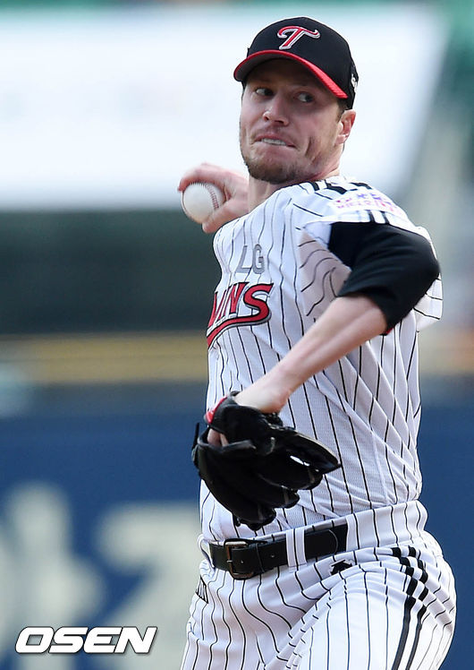 23일 오후 서울 잠실야구장에서 열린 '2015 타이어뱅크 KBO 리그' LG 트윈스와 한화 이글스의 경기,1회초 LG 선발 투수 루카스가 힘차게 공을 던지고 있다.