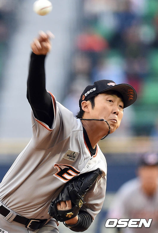 23일 오후 서울 잠실야구장에서 열린 '2015 타이어뱅크 KBO 리그' LG 트윈스와 한화 이글스의 경기, 1회말 한화 선발 배영수가 힘차게 공을 던지고 있다.