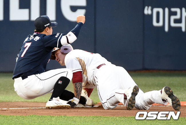 2회말 무사 2루에서 넥센 박병호가 김민성의 2루 땅볼에 3루에서 두산 최주환에 태그아웃 당하고 있다.