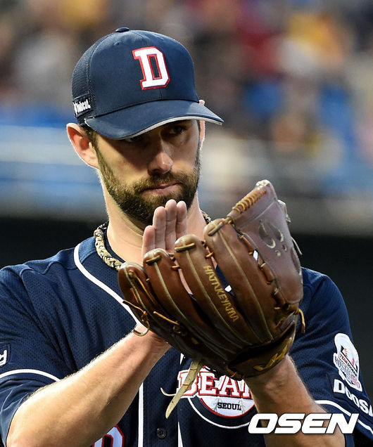 2회말 수비를 마친 두산 니퍼트가 야수들에 박수를 치며 격려하고 있다.