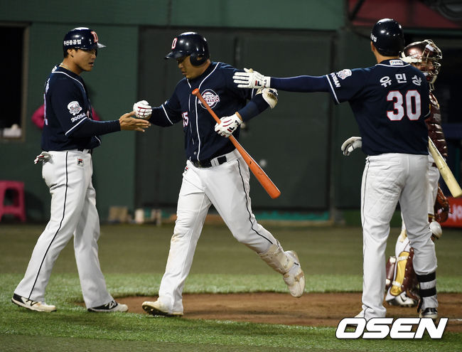 4회초 1사 1루에서 두산 양의지가 역전 투런포를 날리고 홈을 밟으며 홍성흔과 하이파이브를 하고 있다.
