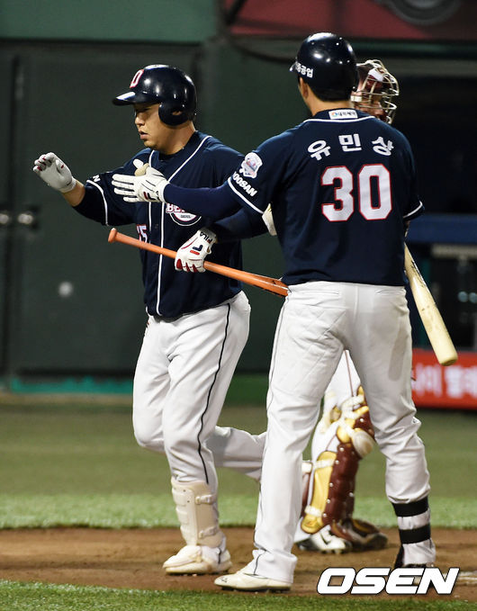 4회초 1사 1루에서 두산 양의지가 역전 투런포를 날리고 유민상과 하이파이브를 하고 있다.