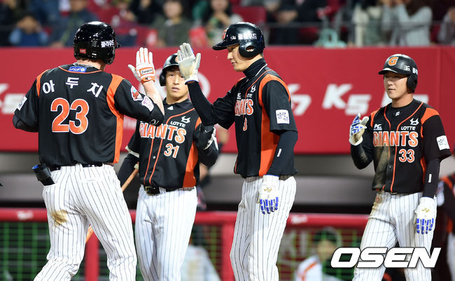 4회초 2사 1,3루 롯데 아두치가 스리런 홈런을 때린 뒤 동료들과 기뻐하고 있다.