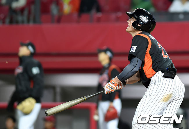 4회초 2사 1,3루 롯데 아두치가 스리런 홈런을 때린 뒤 타구를 바라보고 있다.
