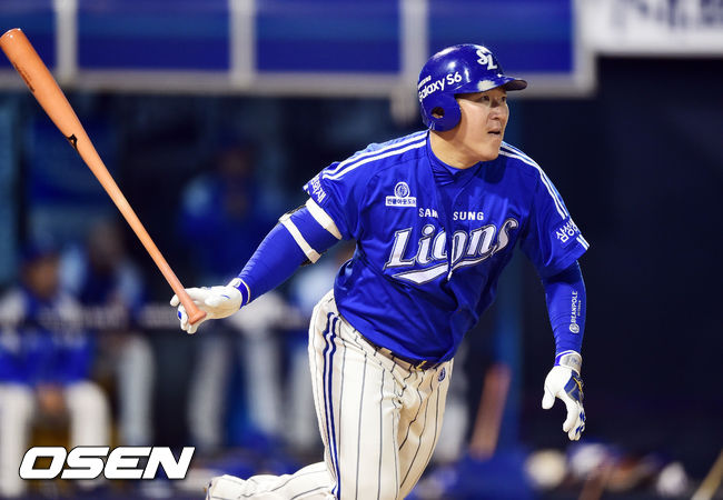 23일 오후 창원시 마산구장에서 열리는'2015 타이어뱅크 KBO리그' NC 다이노스와 삼성 라이온즈의 경기, 5회초 1사 만루 삼성 최형우가 2타점 적시타를 날리고 있다.