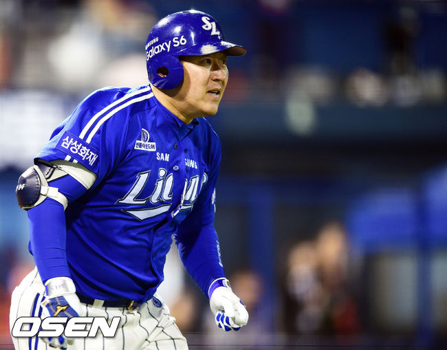 23일 오후 창원시 마산구장에서 열리는'2015 타이어뱅크 KBO리그' NC 다이노스와 삼성 라이온즈의 경기, 5회초 1사 만루 삼성 최형우가 역전 2타점 적시타를 날린뒤 1루로 전력질주하고 있다.