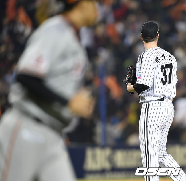 23일 오후 서울 잠실야구장에서 열린 '2015 타이어뱅크 KBO 리그' LG 트윈스와 한화 이글스의 경기, 5회초 2사 주자 1루 LG 루카스가 한화 최진행의 홈런 타구를 바라보고 있다.