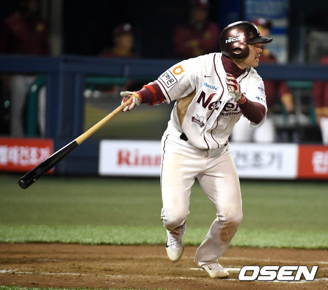 5회말 무사 만루에서 넥센 문우람이 역전 싹쓸이 3타점 적시 2루타를 날리고 있다.