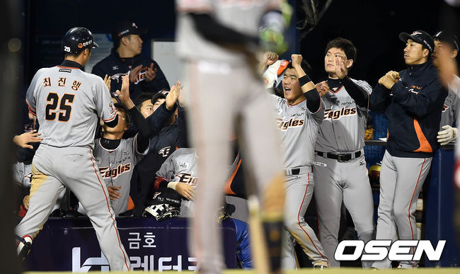 23일 오후 서울 잠실야구장에서 열린 '2015 타이어뱅크 KBO 리그' LG 트윈스와 한화 이글스의 경기, 5회초 2사 주자 1루 한화 최진행이 투런을 치고 더그아웃에서 기쁨을 나누고 있다.