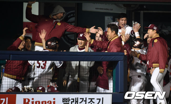 5회말 무사 만루에서 넥센 문우람이 역전 싹쓸이 3타점 적시 2루타에 고종욱, 임병욱이 홈을 밟고 더그아웃에서 동료선수들과 기뻐하고 있다.