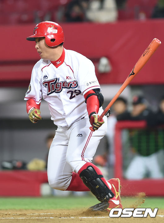 6회말 무사 1,3루 KIA 나지완이 1타점 적시타를 때리고 있다.