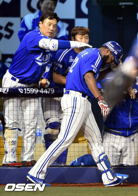 23일 오후 창원시 마산구장에서 열리는'2015 타이어뱅크 KBO리그' NC 다이노스와 삼성 라이온즈의 경기,8회초 삼성 선두타자 나바로가 솔로홈런을 날리고 동료들의 축하를 받고 있다.