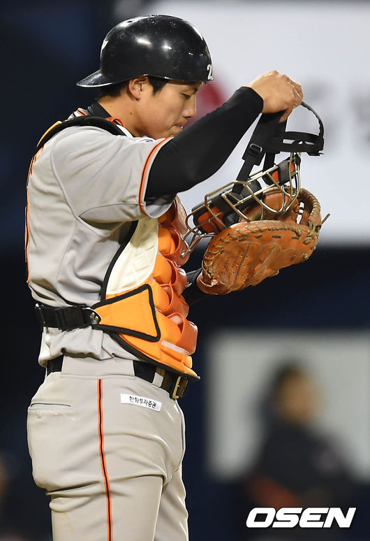 23일 오후 서울 잠실야구장에서 열린 '2015 타이어뱅크 KBO 리그' LG 트윈스와 한화 이글스의 경기, 7회말 2사 주자 3루 폭투로 한점을 내준 한화 포수 정범모가 포수 마스크를 쓰고 있다.