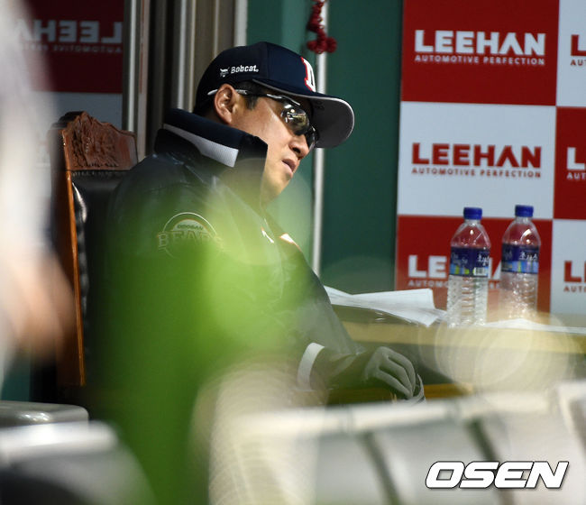 5대4로 뒤진 상황에서 9회초 공격만을 남겨둔 두산 김태형 감독이 더그아웃에서 경기를 지켜보고 있다.