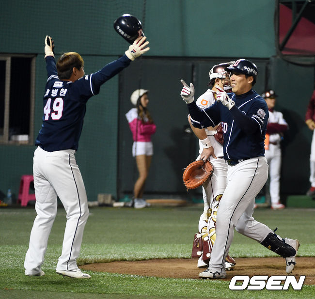 9회초 2사 1루에서 두산 김현수가 역전 투런포를 날리고 홈을 밟으며 민병헌과 기뻐하고 있다.