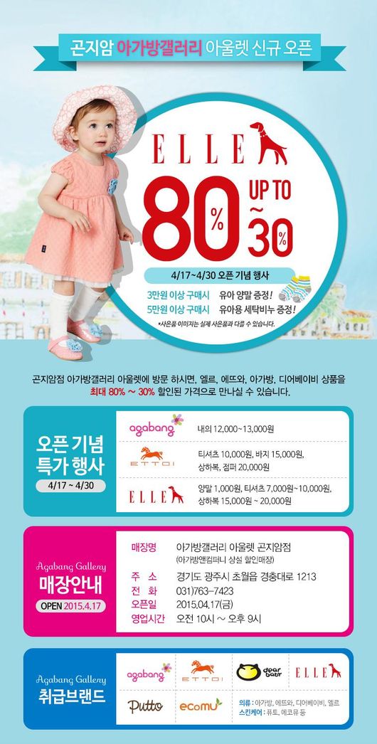 이번에 오픈한 '아가방갤러리 아울렛 곤지암점'은 백화점 유아 브랜드인 에뜨와, 엘르는 물론 아가방, 디어베이비, 퓨토, 에코뮤 등 아가방앤컴퍼니의 모든 브랜드를 만나 볼 수 있는 멀티브랜드숍이다. 약 70평 규모의 대형매장으로 소비자 편의성을 고려해 브랜드 별, 품목 별 쇼핑 공간을 마련하고 동선을 최소화해 쾌적한 쇼핑이 가능하다.