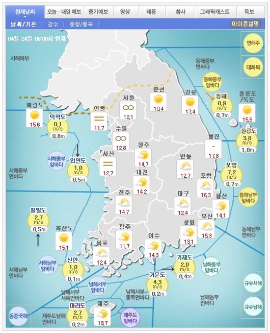기상청 예보에 따르면 24일 오늘의 날씨는 전국이 대체로 맑은 일기를 보이고 있다. 중국 산둥반도 부근에 위치한 고기압의 영향을 받아, 전국이 대체로 맑겠다.