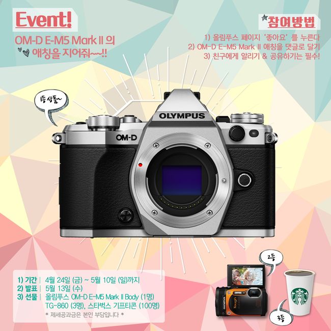 올림푸스한국(www.olympus-imaging.co.kr)이 자사 고성능 미러리스 카메라 OM-D E-M5 Mark II(이하 E-M5 Mark II) 출시 및 공식 SNS 채널 개편을 기념해 ‘E-M5 Mark II 애칭 짓기’ 이벤트를 오는 5월 10일까지 진행한다.