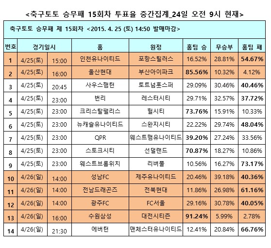 축구토토 승무패 15회차 투표율 중간집계 결과