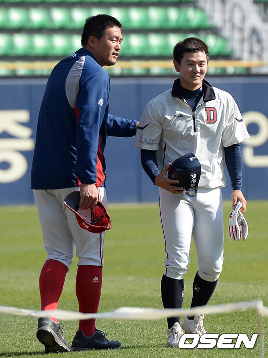 24일 오후 서울 잠실구장에서 열리는 '2015 타이어뱅크 KBO 리그' 두산 베어스와 KIA 타이거즈의 경기 시작전 최희섭과 최주환이 인사를 나누고 있다.